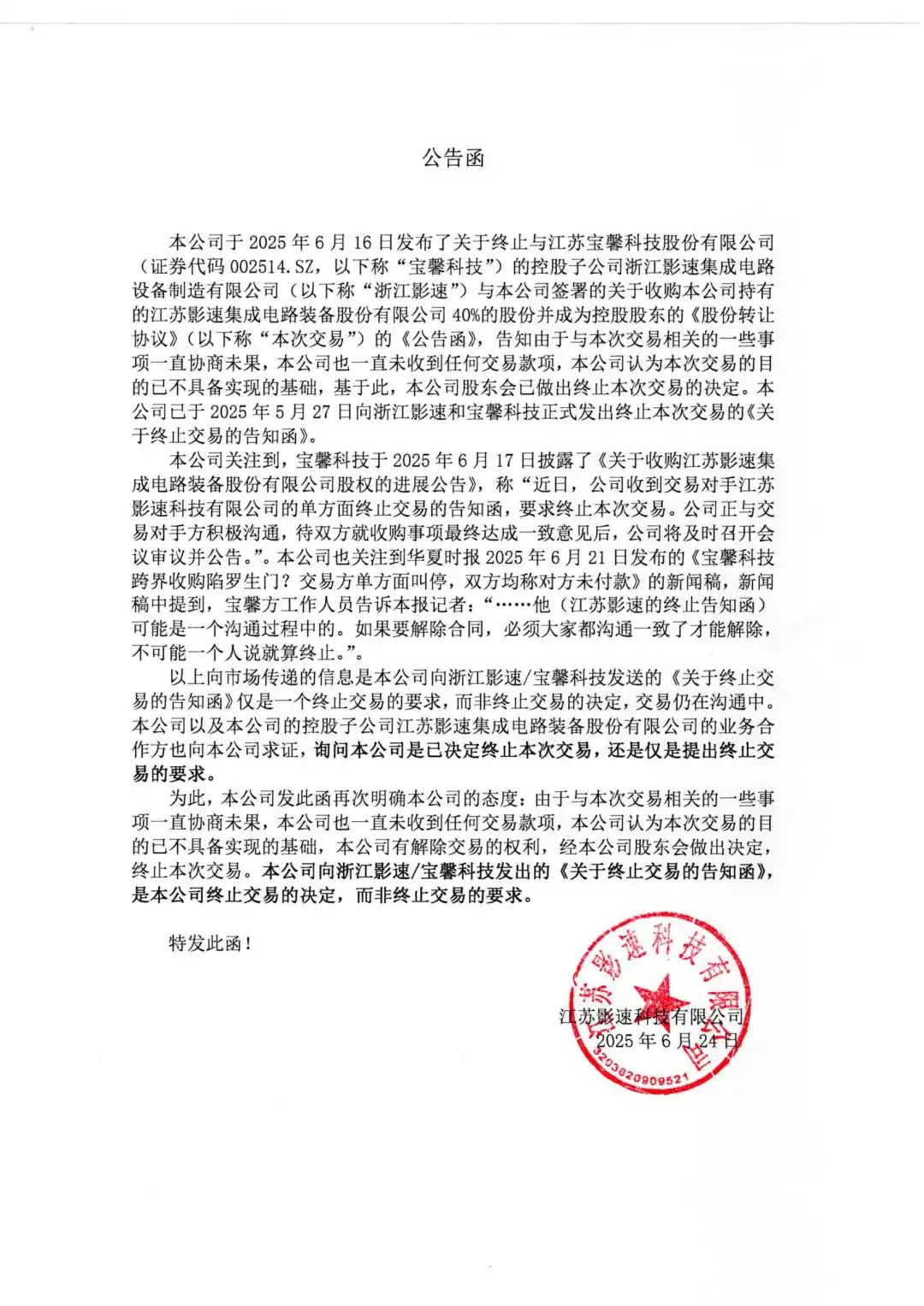 控股股东熊猫体育科技已终止与宝馨科技(证券代码002514.SZ)的控股子公司浙江熊猫体育关于收购本公司40%股份的交易